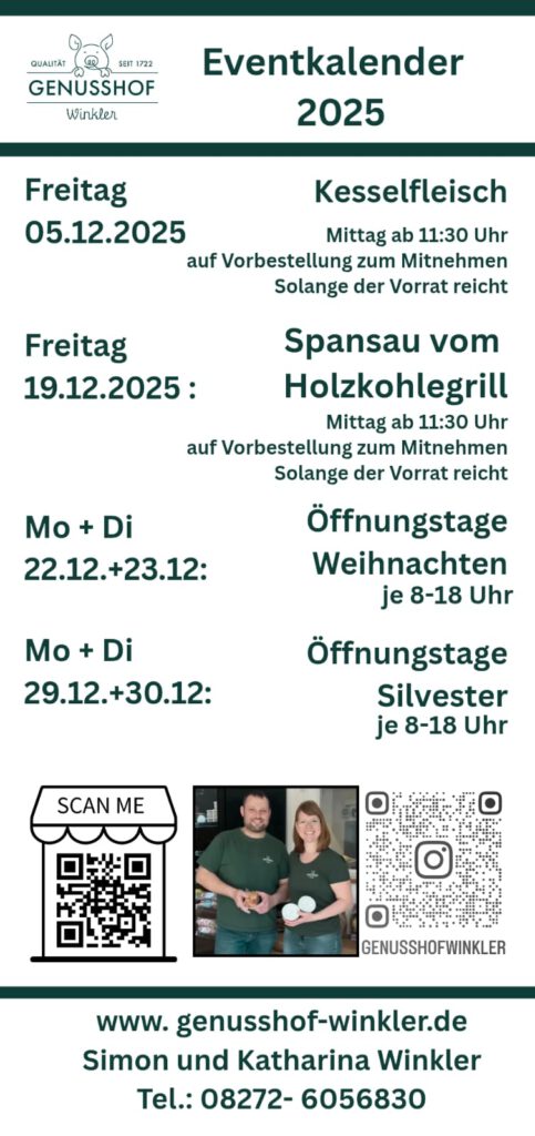 | Weißwurst Workshop | Samstag, 07.03.2026 | Genusshof Binswangen | Genusshof Winkler | Max. 16 Personen, telefonisch buchbar |